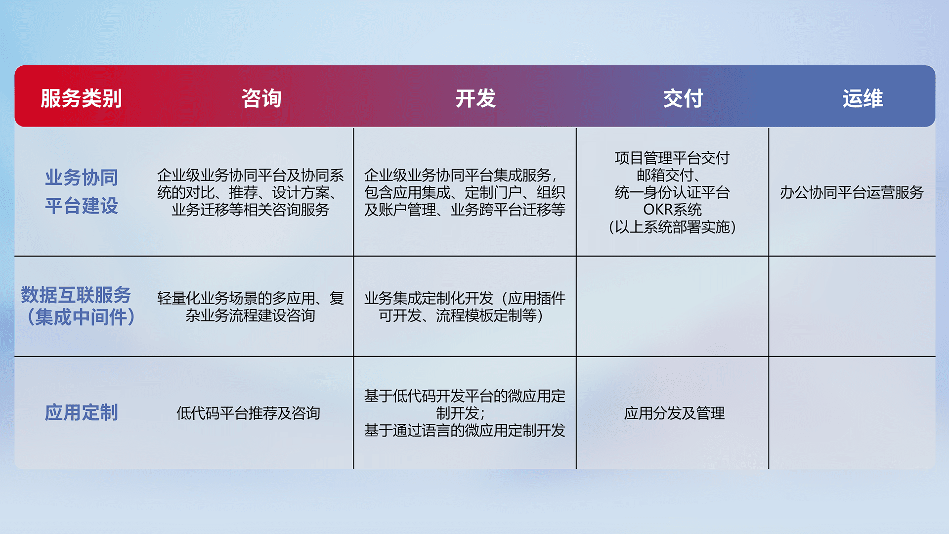 针对钉钉、、、企微、、、IDaas等平台级产品提供产品的规划、、、、方案、、、交付、、定制化开发等服务,,,,实现如统一协同办公、、、智能客户服务、、混合会议管理、、、智能数据查询、、、、等业务场景,,,实现数字化转型。。